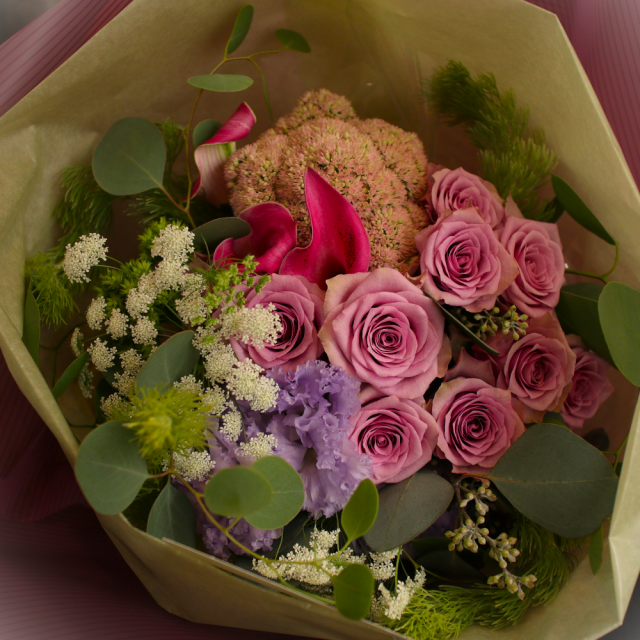 上品色の花とグリーンで彩ったスタイリッシュなアレンジメント。祝い事に最適。アプリコット・グリーン以外も選択可。